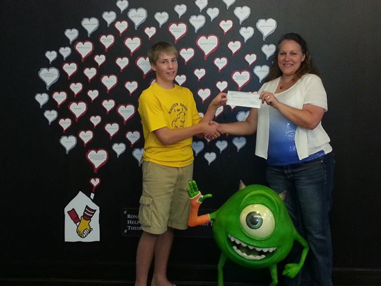 Rhys Dulisch (left) handing over a check for $6413 to the Ronald McDonald House of Southwestern Ontario from the 2014 Soccer Dogs tournament – Contributed Photo