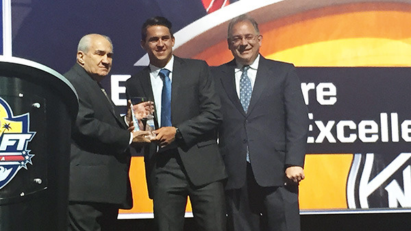Konecny, who captained the OHL’s Ottawa 67s this season, was presented with the award on the second day of the 2015 NHL Draft.