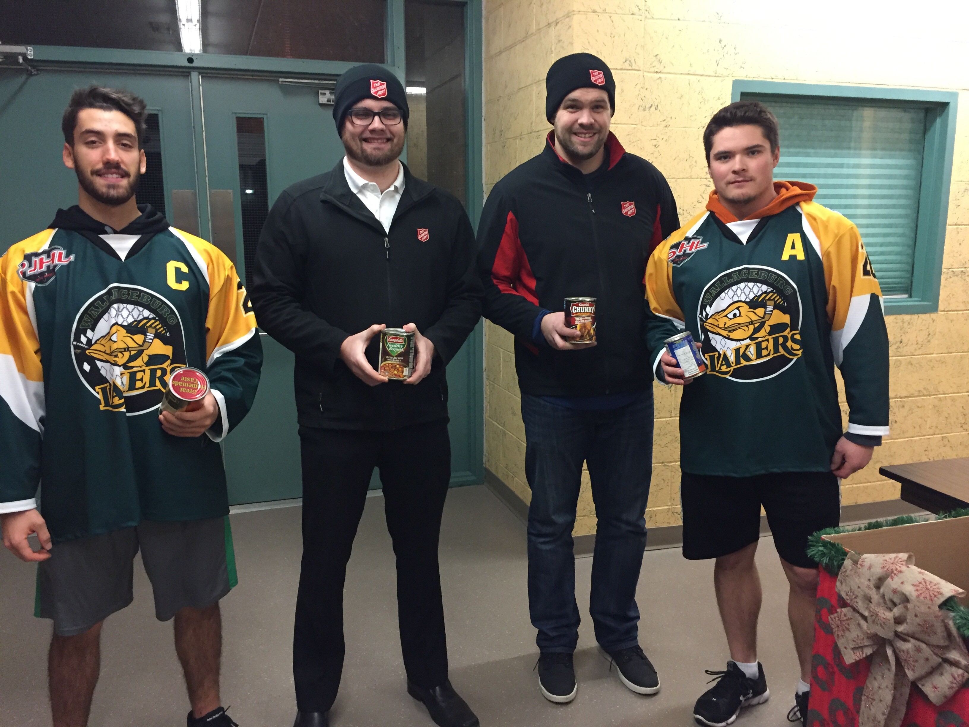 Wallaceburg Family Services Worker Mark Burford (pictured below, right of Captain Shield) is thankful for the organizations like the Lakers who continue to working with the Salvation Army to meet the needs of their community. He notes that all funds and canned goods raised at the game will stay in Wallaceburg as is their policy for local fundraisers.