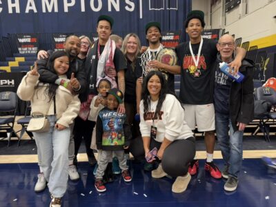Family and friends celebrate with Caleb Roberts, C.J. Roberts and Jaxen Baker, after the Chatham basketball players led Ridley College to an NPA title on March 28.